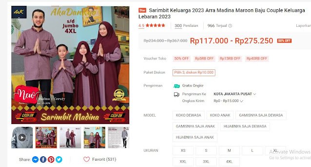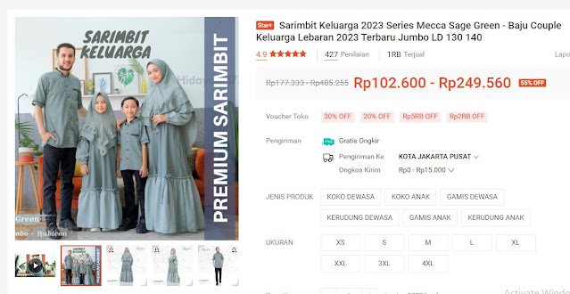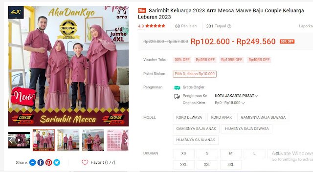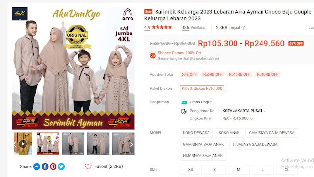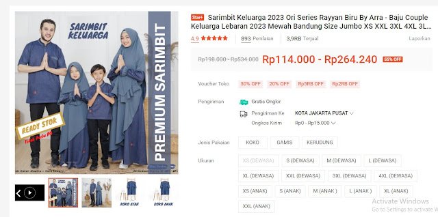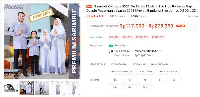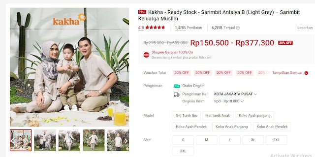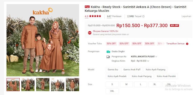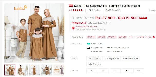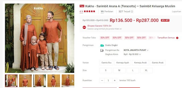 Harga tersebut bervariasi tergantung pilihan apakah baju koko anak laki-laki, koko pria dewasa, baju gamis anak perempuan maupun baju gamis wanita dewasa. Harga terendah ditempati kemeja anak laki-laki seharga Rp 136.000, kemudian diikuti oleh gamis anak seharga Rp 157.000, kemeja ayah Rp 168.000 dan gamis ibu Rp 287.000. Ini harga normal dan belum termasuk diskon. Nah, saat saya menulis artikel ini saya mendapati tersedia sekitar 25 voucher diskon yang dapat diklaim. Diantaranya voucher diskon 50 % minimal belanja Rp 30 ribu sampai dengan dengan 15.000, voucher diskon 15.000 minimal belanja 100.000, diskon 20.000 minimal belanja 200.000 dan diskon 30.000 minimal belanja 300.000. Lumayan banget kan ?