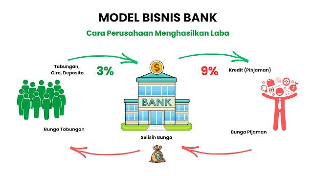 secara sederhana, model bisnis bank membantu menyimpan dana dari masyarakat melalui tabungan, deposito maupun giro. dimana kemudian dana inilah yang disalurkan kembali kepada masyarakat melalui kredit. Misalnya bank memberi bunga hingga 3% untuk masyarakat yg menyimpan uang di bank dan memberi bunga 9% bagi masyarakat yang mengajukan pinjaman atau kredit. selisih bunga inilah yang menjadi sumber pendapatan bank.