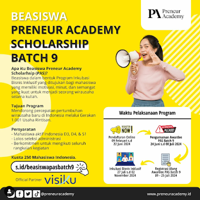 | Informasi Pendaftaran Beasiswa Preneur Academy Scholarship (PAS) Batch 9 Tahun 2024 (Foto: Instagram @preneuracademy) |