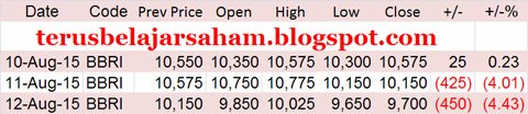 Bayangkan anda membeli BBRI pada tanggal 11 Agustus 2015 di harga Close 10.150. Saat memantau harga pada tanggal 12 Agustus, anda bengong melihat BBRI Open di 9850, naik ke High 10.025, lalu turun lagi ke 9.850 dan lanjut turun ke Low 9.650.