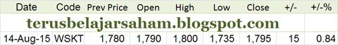 Contoh: Mengacu pada Tabel 1, Range harga WSKT pada tanggal 14 Agustus 2015 = High – Low = 1.800 – 1.735 = 65.