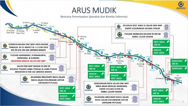 Untuk menunjang kelancaran arus lalu lintas mudik dan balik lebaran 2019, jalur arus mudik dan balik lebaran tol trans jawa di atur dengan menggunakan Sistem satu arah atau one way. Sistem satu arah atau one way akan diterapkan di Tol Cikampek hingga Tol Brebes saat arus mudik Lebaran 2019, yaitu pada 30 Mei hingga 2 Juni 2019. Adapun kebijakan tersebut akan berlangsung sepanjang hari alias 24 jam non-stop.