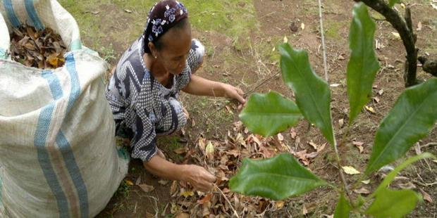 rela mengumpulkan satu persatu daun cengkeh yang berserakan di bawah