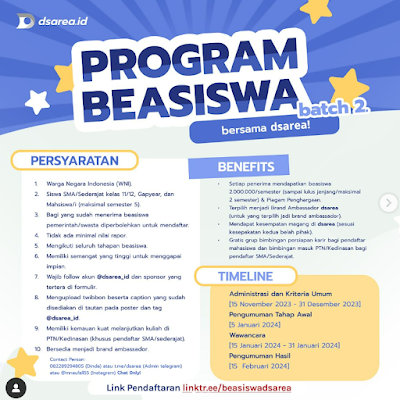 | Informasi Pendaftaran Beasiswa Dsarea Batch 2 Tahun 2023 (Foto: Instagram @dsarea_id) |