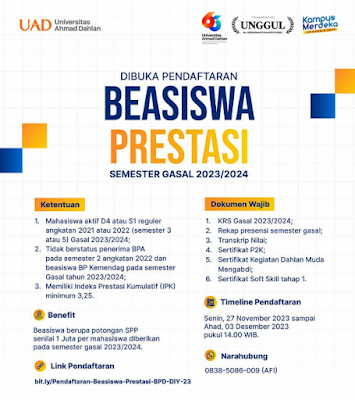 Semester Gasal Tahun 2023/2024. Pendaftaran Beasiswa Prestasi Universitas Ahmad