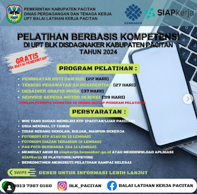 | Informasi Pendaftaran Pelatihan Kerja Gratis Berbasis Kompetensi Angkatan 1 Tahun 2024 BLK Disdagnaker Pacitan |